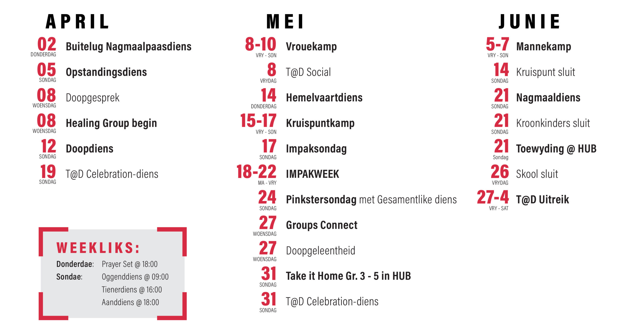 Ons droom van volwasse gelowiges wat vurig die wêreld impakteer. Hierdie realiseer deur ons fokus te plaas om God te AANSKOU, Hom te VOLG, mense TOE TE RUS en dan local en translocal ‘n IMPAK te maak.